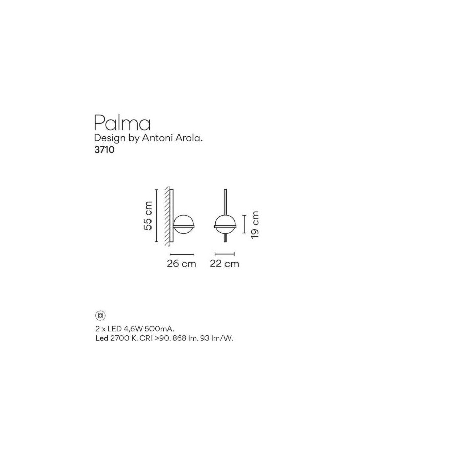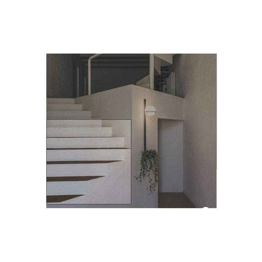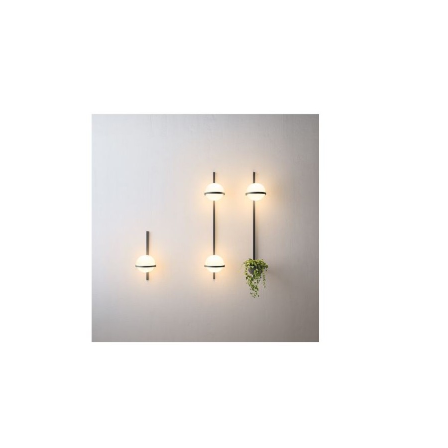Palma diseñada por Antoni Arola para Vibia es una colección de lámparas de pared con perfil de aluminio y difusor de vidrio soplado. Algunas configuraciones se proporcionan de jarrones de PMMA para la inserción de las plantas.